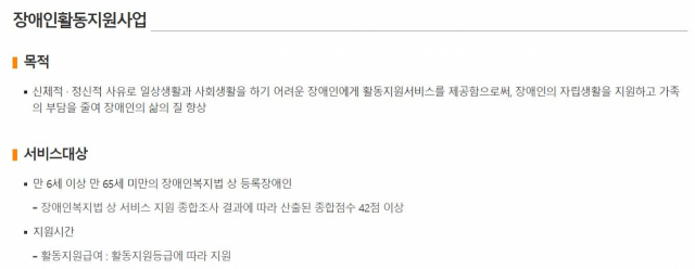 장애인활동지원사업은 장애인복지법에 근거하여 혼자서 일상생활을 하기 어려운 장애인에게 활동지원급여를 제공하여 장애인과 가족의 삶의 질을 향상시키는 사업입니다. 활동지원사가 장애인의 신체활동이나 가사활동, 사회활동을 도와주고 필요에 따라 방문목욕, 방문간호도 받을 수 있습니다. 만6세에서 65세 미만의 등록장애인을 대상으로 하고 방문조사와 심의를 통해 장애 정도를 평가하여 지원을 하게 되어 있습니다. 중증장애인분들이나 보호자분들이 도움이 필요하다면 주소지의 주민센터로 문의하여 신청하실 수 있습니다. (관련 내용 바로 가기 : 클릭)