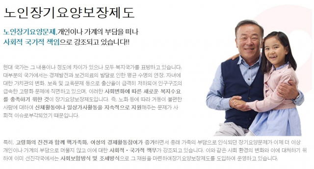 노인장기 요양보험제도는 만65세 이상의 노인 혹인 나이가 만65세 미만이더라도 치매나 파킨슨병, 뇌경색 등 노인성 질병 때문에 일상생활을 혼자서 수행하기 어려운 어르신들에게 요양급여를 제공하여 본인과 가족의 부담을 덜어주는 사회보험제도입니다. 건강보험제도와 별개의 제도지만 국민건강보험공단에서 관리를 하고 있습니다. 만약에 집에 어르신이 계신데 거동이 불편하다면 이 제도를 통해 요양서비스를 받을 수 있습니다.