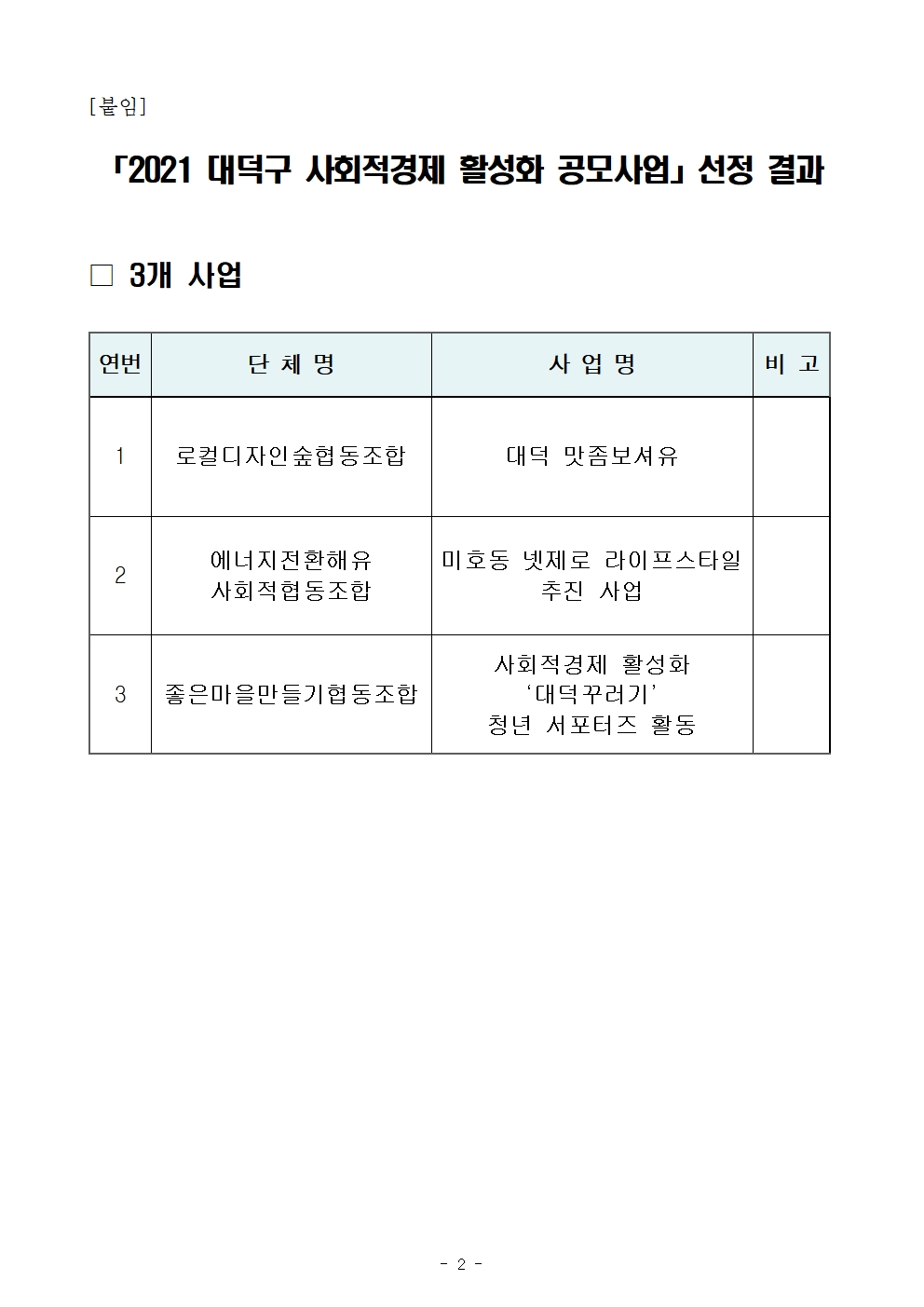 2021 대덕구 사회적경제 활성화 공모사업 선정공고 상세내용