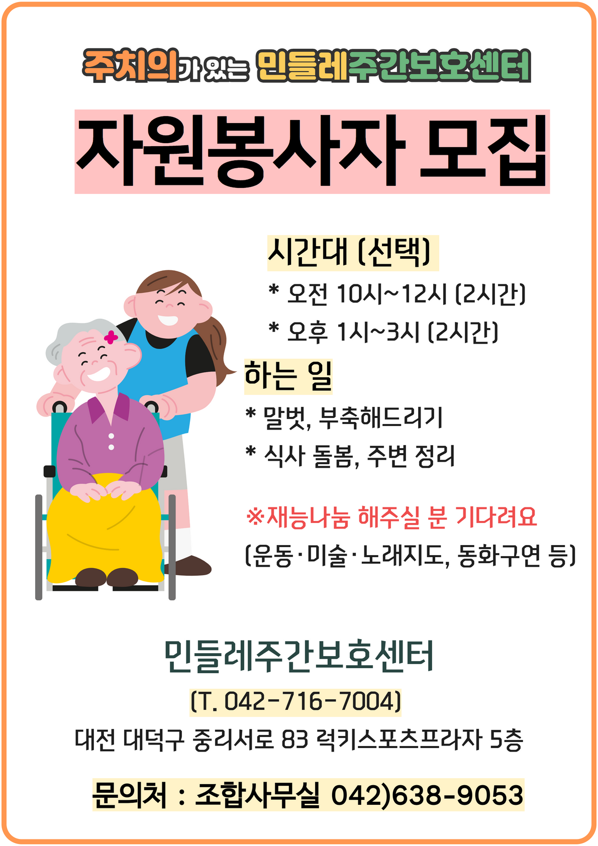 | 제목 | 주간보호센터 자원봉사자 모집 |