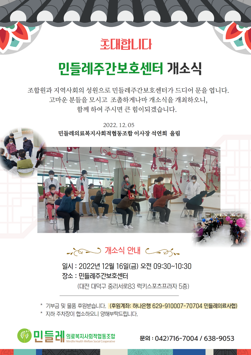 | 작성자 | 민들레의료복지사회적협동조합(mindlle) | 작성일 | 2022-12-07 | 조회수 | 22722 |