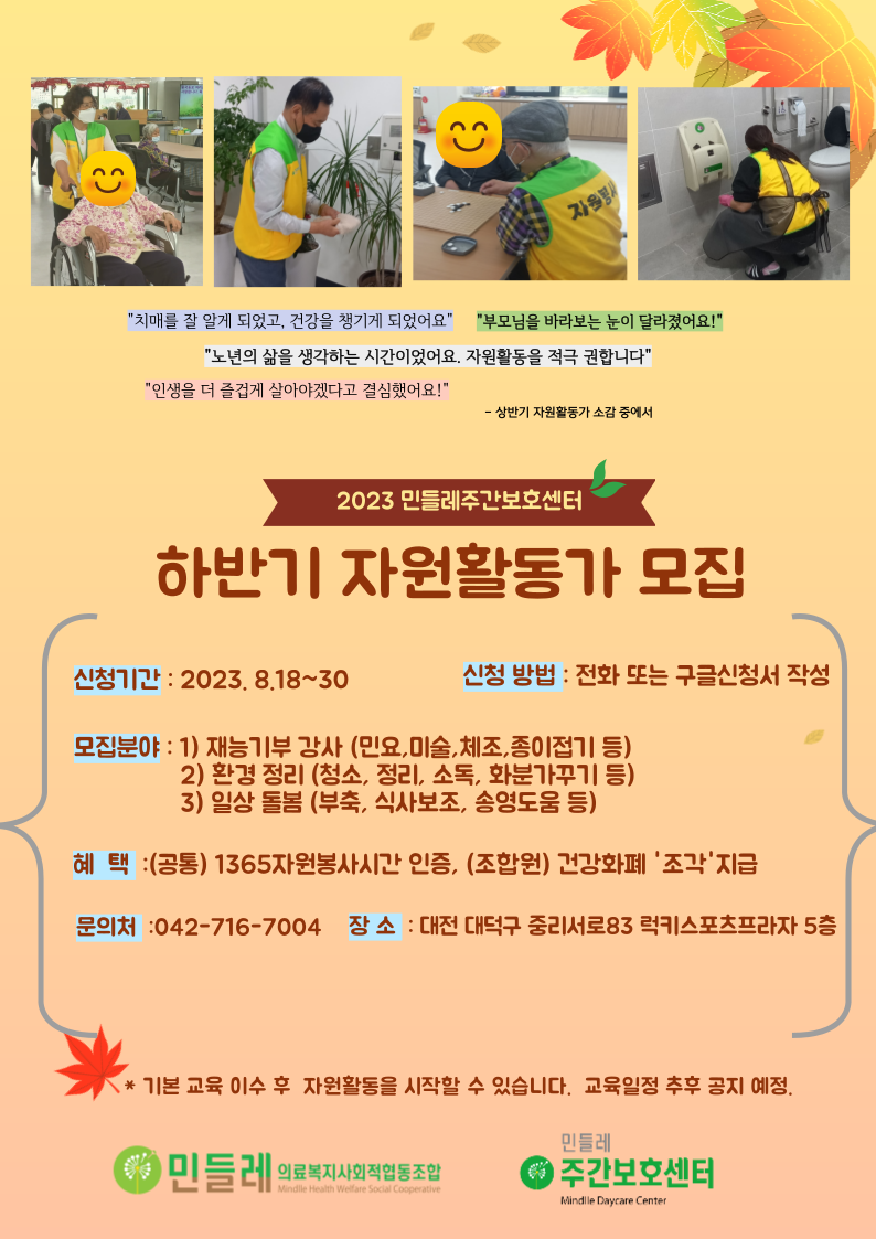 | 제목 | [자원활동모집] 주간보호센터 자원활동가를 기다립니다 |