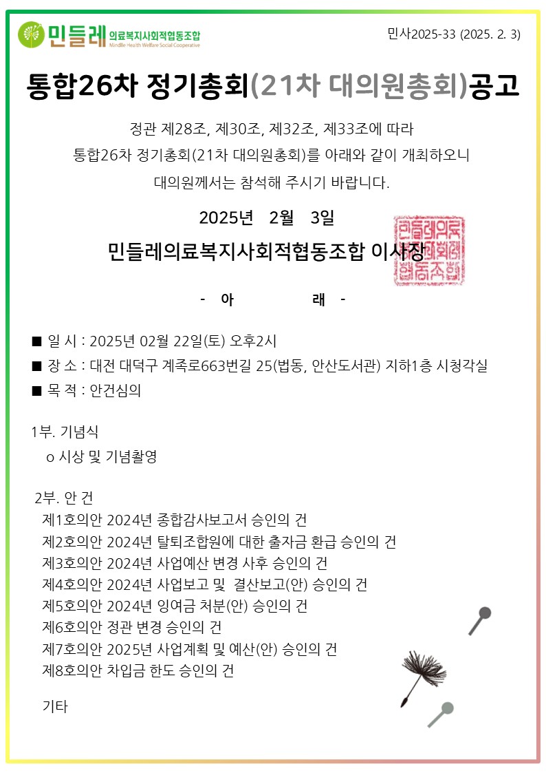 | 작성자 | 민들레의료복지사회적협동조합(mindlle) | 작성일 | 2025-02-03 | 조회수 | 10900 |