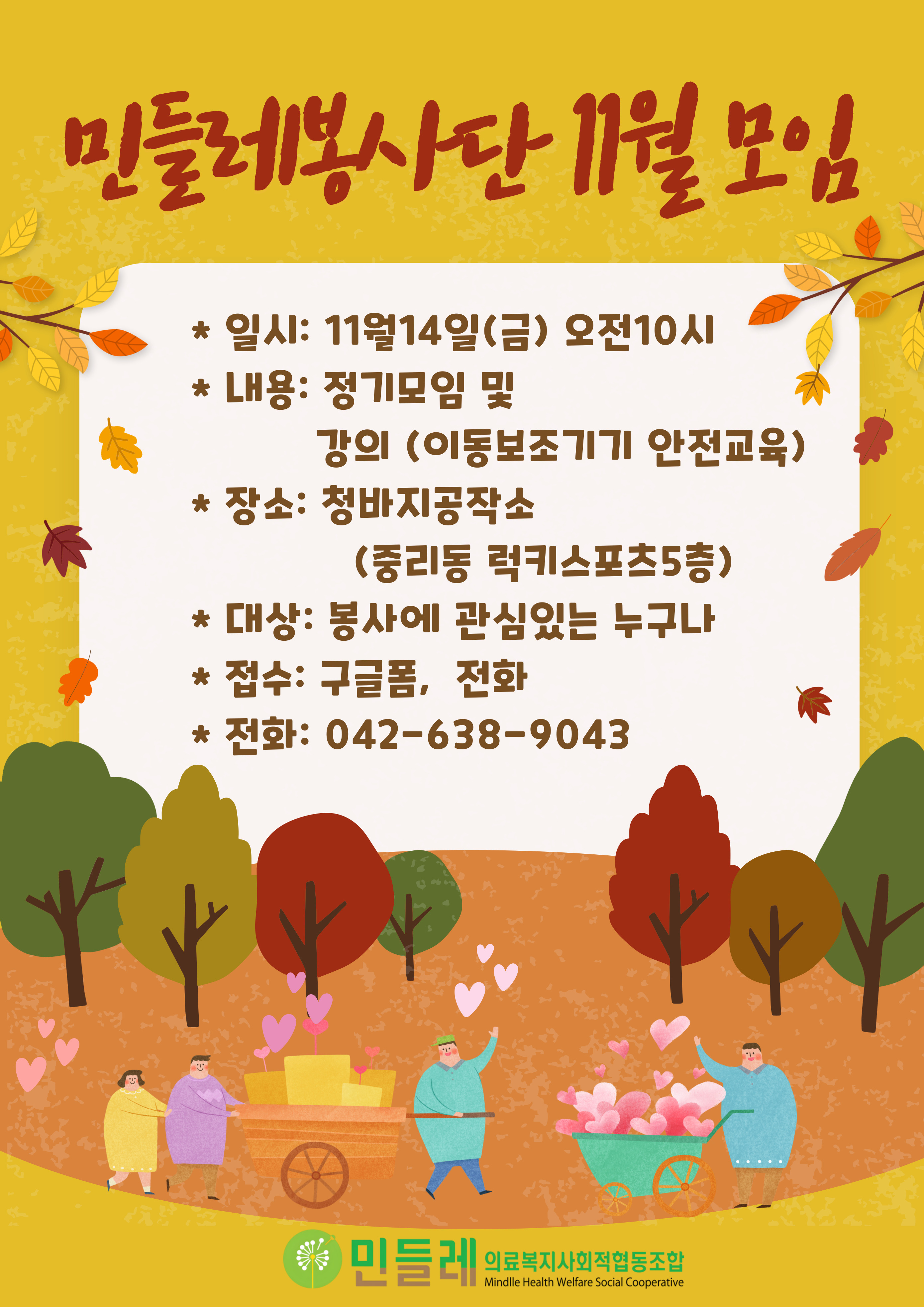 | 작성자 | 민들레의료복지사회적협동조합(mindlle) | 작성일 | 2025-11-04 | 조회수 | 3593 |