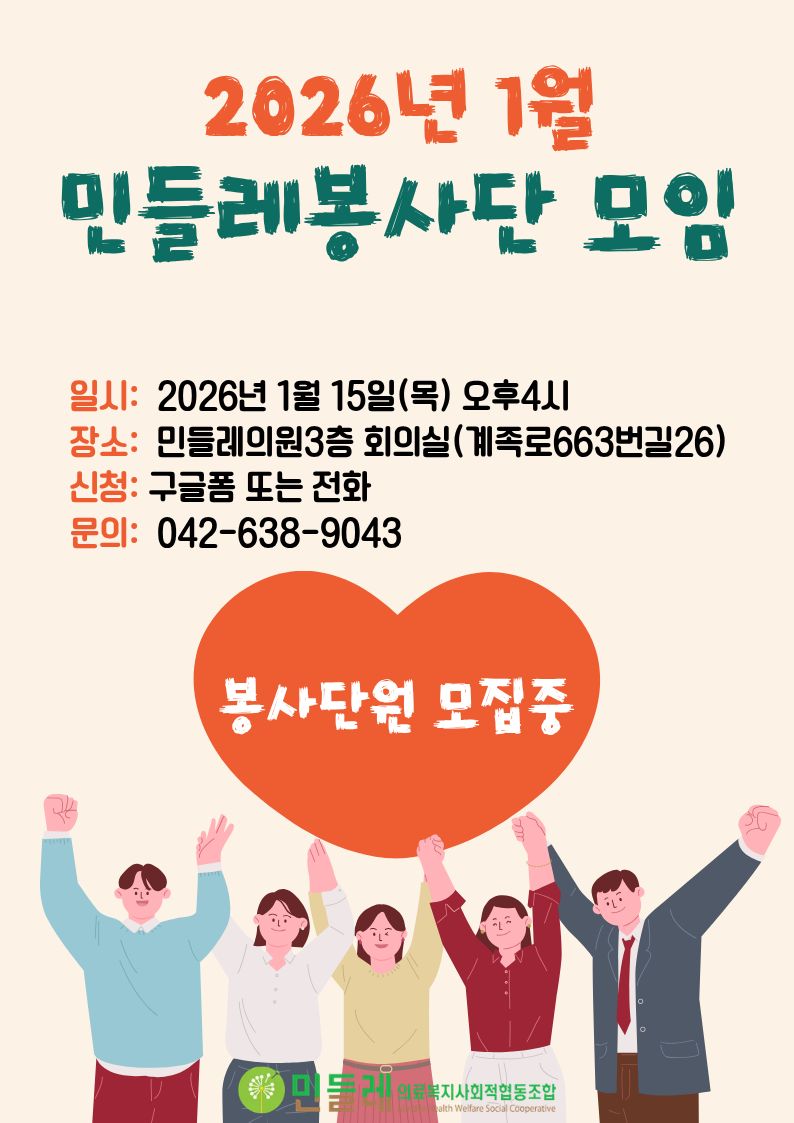 • 일시: 2026년 1월 15일(목) 오후 4시 • 장소: 민들레의원 3층 회의실(계족로663번길26) • 신청방법: 구글폼(https://forms.gle/hW3QepRCaKymgCmx7) 또는 전화접수 • 문의: 042)638-9043