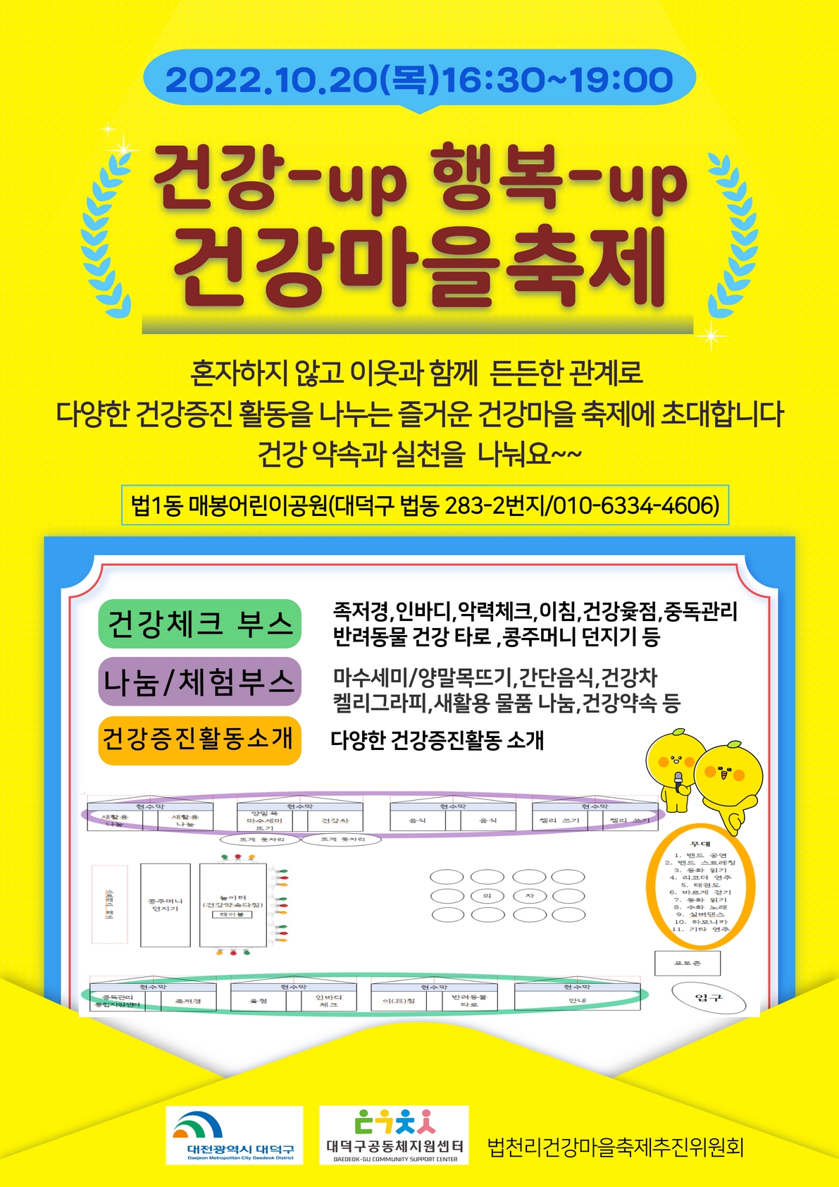 건강을 주제로 마을 사람들과 건강반이 다양한 활동과 즐거움을 나누는 축제를 펼칩니다 혼자서는 오래하기 어렵고 혼자서는 재미없지만 같이하면 더 신나게 건강 활동을 나눌 수 있어요 초대합니다 10월 20일(목) 법동에서 만나요~~