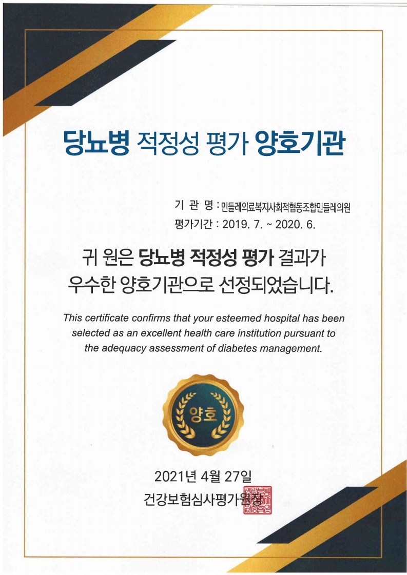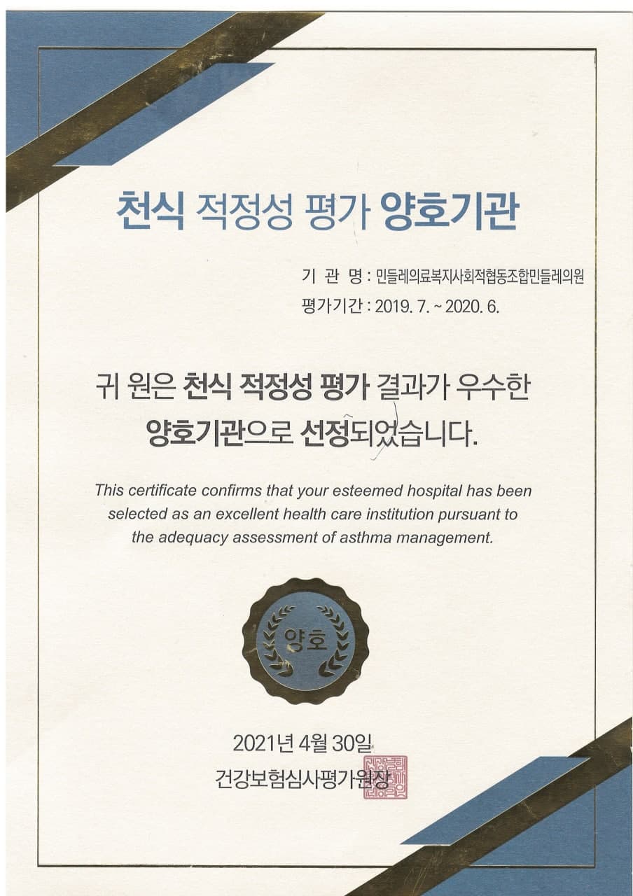 천식부분에서 양호 기관으로 선정되었습니다.