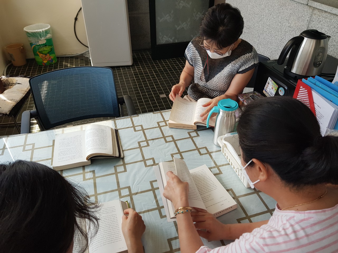 코로나로 인해 여럿이 모여 활동할 수 없어 도서관에서 책 봉사하고 간단한 다과를 나눴습니다